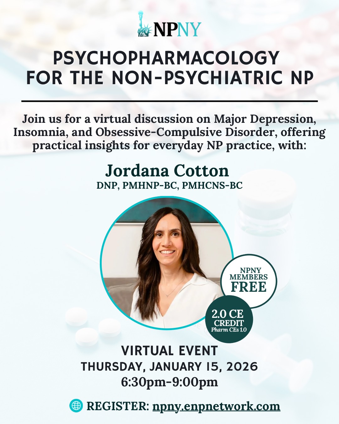 - 8:30pm - 9:00pm Immediately following program, NPNY announcements, New Jobs, Discuss clinical cases, Networking, Find a Mentor/Mentee